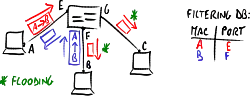 - backward learning: learning is based on source MAC address: when a frame arrives at a certain port, the bridge checks if there is already the source associated to that port in the filtering database, and if needed it updates it.