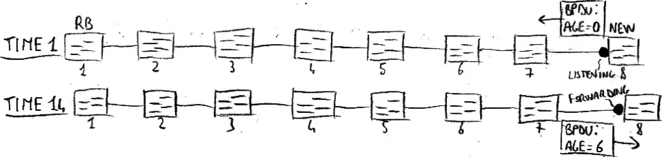 When a new link is inserted, the ports which the new link is connected to become designated in listening state, and start propagating Configuration BPDUs generated by the root bridge in the network → new Configuration BPDUs arrive through the new link: