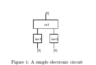 As a running example consider the simple digital circuit in figure 1 consisting of an or-gate () and two inverters ( and ). The system description is given by the following propositional formulae, where the formulae are labeled in order to facilitate recognition of corresponding parts in figure 1. The mnemonic used in the names within the formulae is the following: