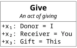 This says that we have a variable ("x") place 1 that is a donor, a place 2 that is a receiver and a place 3 that is a gift. They share the relation "give".