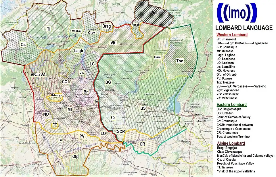 • It belongs to the Gallo-Italian group, and therefore has strong similarities with Piedmontese, with Emilian, with the more rustic and conservative dialects of the Venetian language of Trentino and Veneto. There are several transition areas (in Piedmont, in lower Lombardy, in Trentino), and therefore linguistic boundaries are not always unanimously accepted.