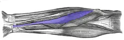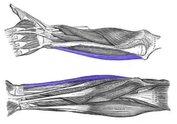 Mirrors the course of the flexor digitorum superficialis, but inserts more distally. |