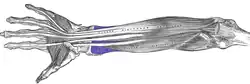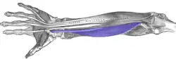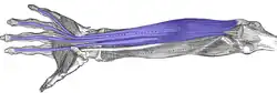 | Pronator quadratus | A small, flat, quadrilateral muscle, extending across the front of the lower parts of the radius and ulna. It helps to bind the two bones together. | Pronates forearm. | Anterior interosseus nerve, from median nerve (C8+T1) | ![]() |
