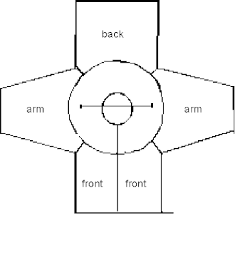 If you want to avoid a seam in the middle of the front and the back - e.g. if you want to make a pattern on the belly - you may proceed as follows: Cast on half the hip circumference for the front. Start at the crotch with contrast coloured yarn in two halves divided at the middle. Thereby you can knit upwards in the pattern that you want, and need not knit the pattern from above, which not all machines can do automatically. Knit until you reach the armhole, cast off a few stitches, and increase one stitch in the beginning of each row. Finish with a rib border or a seam and make a buttonhole in each side. Knit a back piece in the same way, but leave a few stitches in each side for shoulder straps and place them on a safety pin. The sloped edge will not roll, so it is not absolutely necessary to make a crochet border.