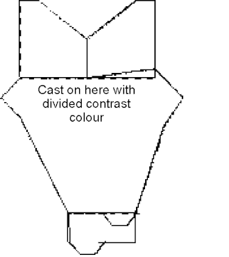 You begin at the bottom and cast on the measurement of the chest circumference. The sides are the middle of the front. Knit straight up to the armholes. Knit in contrast coloured yarn on 1/4 of the stitches in both sides and release the knitting; but you have to knit the outer 1/4 of the stitches before you enter the contrast coloured yarn; otherwise the thread will not be where you need it. This part will become the lower part of the front pieces, which are later bent around to the plain side and stitched upon the upper part of the front pieces.