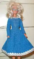 If you have a ribber, you can make the skirt with pleats in the following way: Use thin yarn and all the needles. Then take for example every nineth needle out of function, and place the stitch on the neighbour needle. Do this both on the ribber and on the knitter, but shift it so that the holes on the ribber are in the middle of the space between the holes on the knitter. A pleated effect will appear. Make some samples with different stitch sizes and different spaces between the holes, so that you can choose what looks best with your yarn.