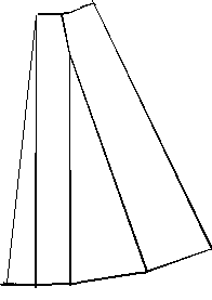 When you have designed the basic pattern for your skirt, you can make different fashions as figures 8 and 9 show. You can draw a vertical line through the middle of the tuck and down to the edge. Then cut the line and fold the pieces away from each other so you get more width. On figure 8, the pieces are folded until half of the tuck disappears. Besides, there is a little extra width in the front and the side. These pieces must only be half the size of the piece at the tuck, as the pieces will be twice as wide because you only draw 1/4 of the whole skirt.