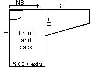First, you mark out BL along a vertical line; and perpendicular to that, at its bottom end, you mark out 1/4 UC for the back, and 1/4 UC plus half the difference between CC and UC for the front. Having come so far, you turn again upwards at right angles. On top, the shoulder line is drawn perpendicular to the back line. Along it, you mark out NS, and from there, you turn down at right angles and mark out AH, which may be equal to NS or slightly more, if you want. At the last part of it, you round out outwards to meet the sideline. You find the neck by halving NS and use the same measurement vertically and horizontally. You may slant the shoulder line as shown in the drawing, but it is a matter of maximally 2 cm.