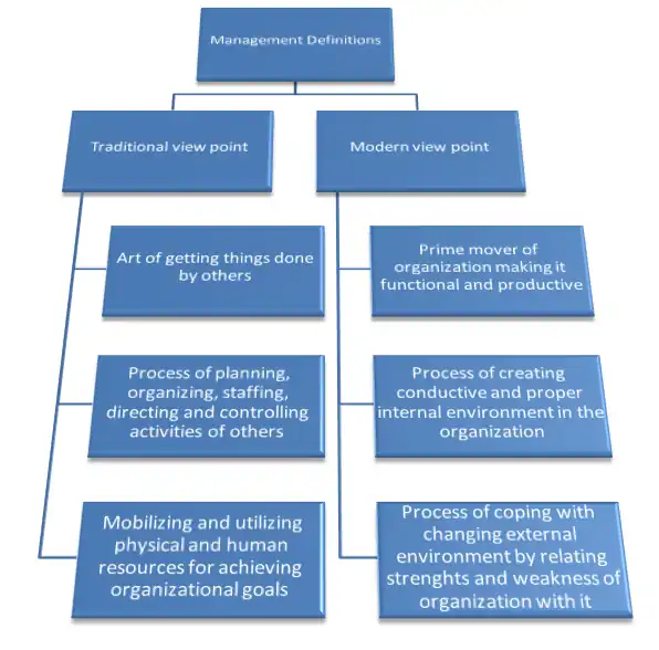 But a simple traditional definition, defines it as the "art of getting things done by others". This definition brings in two elements namely accomplishment of objectives, and direction of group activities towards the goal. The weaknesses of this definition is that firstly it uses the word "art", whereas management is not merely an art, but it is both art and science. Secondly, the definition does not state the various functions of a manager clearly.