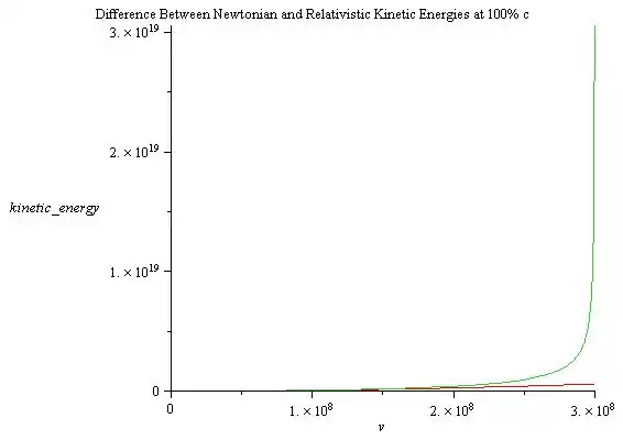 plot([kinetic2(13, v), kinetic (13,v)], v=0..c,kinetic_energy, title="Difference Between Newtonian and Relativistic Kinetic Energies at 100% c");