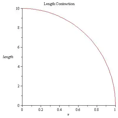 Explained by the theory of special relativity, length of an object as viewed from another frame of reference contracts as it moves in a direction along its length. In fact, as the object's relative velocity approaches the speed of light, the length of the object approaches zero. In theory, the object will never actually reach the speed of light. The equation for this is L_prime= L/Gamma. L_prime is the contracted length, and L is the 'proper length' or the length measured in the frame of the object. Gamma is the problem above. Plot the graph of L_prime for a limousine that is 10 meters long from v=0 to c.