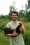 One rooster and one man.