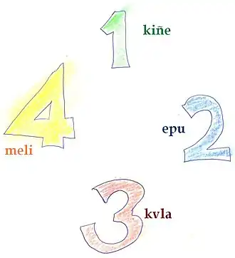 "Kiñe, epu, kvla, meli" in colours