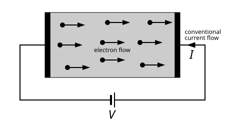 Remember that since electrons hold a negative charge, a flow of electrons is in the opposite direction to the conventional current, I. In the diagram below, the conventional current flows from right to left in the conductive material (grey). The electron flow produces a current in the same direction, but the particles themselves are moving the other way, from left to right.