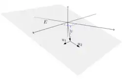 Let us now abstract our illustrative example. Our space is the -vector space . Mathematically, displacements from the origin are described by vectors. Displacements that cause the same change in potential energy for a point particle move it from the origin in to the same plane parallel to the - plane, since exactly the point particles on this plane have the same potential energy. For a given change in potential energy, we can choose any of the vectors causing such a change as representatives.