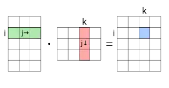 According to the definition, each entry in the product is the sum of the component-wise multiplication of the elements of the -th row of with the -th column of . This procedure can be remembered as row times column, as shown in the figure on the right.