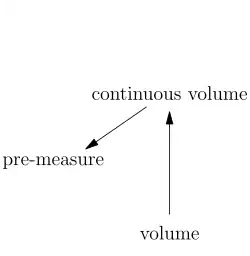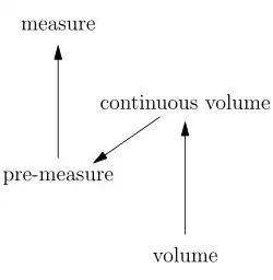 For volumes, as shown in the sigma-additivity section, the equivalence between continuity and -additivity holds. Because -additive volumes are even pre-measures, a volume is continuous if and only if it is a pre-measure.
