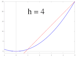 Definition of the derivative via the h-method: For the respective h-values the corresponding secants are drawn in. You see that for the secant changes into the tangent and thus the secant slope (difference quotients) changes into the tangent slope (derivative).