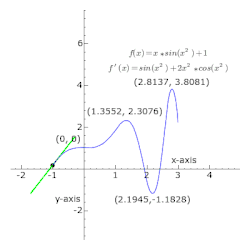 Thus the derivative is equal to the slope of the tangent to the graph through the point . we may also use the derivative to compute the tangent to a graph. With we know the slope of the tangent. The offset can be determined using that is a point on the tangent. The following question illustrates how this works: