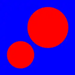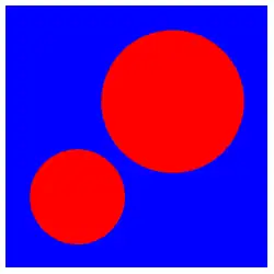 First, we will make a 2D graphics object graphic consisting of a blue square and two red circles to demonstrate: