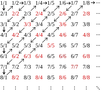 This diagram arranges all rational numbers in an infinite array. Then, we obtain an infinite list of all rational numbers, following the arrows in the diagram:
