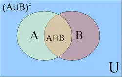 The diagram to the right is a Venn diagram. A Venn diagram shows the relationships of sets. Note that in the figure, U is the universe, and A and B are sets in U. The blue portion is the complement of . This is a general drawing, since it is not known whether there are elements in A and B. If is known to be empty, then they may be drawn disjoint.