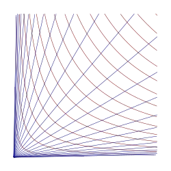 The laws of economy apply on macro and micro scales as far a population goes. Thus the quadrant has an infinite density near the origin, and the level curves xy = constant express a reference but are not paths of least distance in Q, as developed below. The hyperbolic angle parametrization of Q complements the level curves and provides a portal to the higher geometry of Q: the rays from (0,0) represent constant slopes as well as constant hyperbolic angles. The half plane (u,v) with positive v, takes the geometric mean, square root of xy, to determine v. The hyperbolic angle of a point in Q corresponds to u in the half plane: u = log √(x/y).