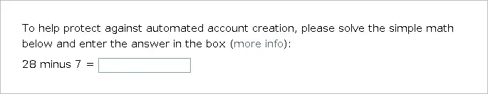 SimpleCaptcha is the default captcha in ConfirmEdit. This captcha prompts user to solve a simple math question to prove that they are not spam bots: