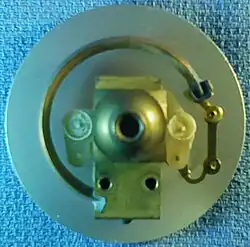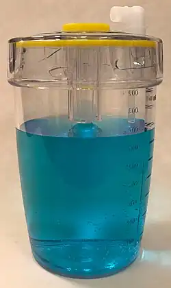 A common implementation of an overflow valve is a spherical element similar to a ping-pong ball which will block the suction channel when elevated. The ball is buoyant and is elevated by increasing level of liquid. Such a valve is below the lid of the Laerdal collection vessel. The ball is immediately above the blue dyed water. The valve must be cleaned thoroughly along with other surfaces in the vessel when it is emptied and cleaned.