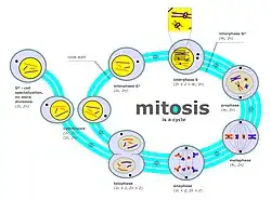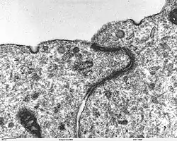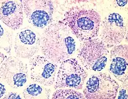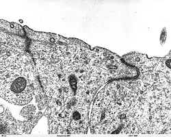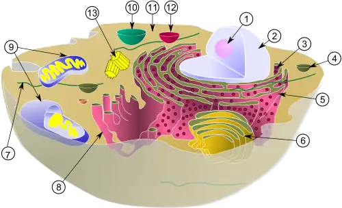 The thumbnail on the right shows the typical features of a cell as seen under with a light microscope using a standard stain. The chief features are a cell membrane, a granular cytoplasm, and a nucleus with in most cases a darker staining nucleolus.