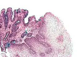 In Barrett's esophagitis the stratified squamous epithelium at the lower end of the esophagus is replaced by intestinal-type lining (columnar epithelium), due to reflux esophagitis. It is considered a pre-malignant condition as about 0.5% per year of patients will go on to develop esophageal cancer (adenocarcinoma of the esophagus).