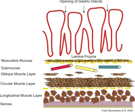 The basic layout pattern holds true in the stomach, although the stomach has a third inner layer of oblique muscle fibers. The mucosal layer has numerous pits opening into the lumen, the mouths of the gastric glands. Some of these glands penetrate down into the submucosal layer.
