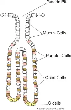 The composition of the gastric glands varies throughout the stomach. In the fundus, the glands are more branched and contain all the different kinds of secretory cells. In the pyloric part of the stomach the glands are deeper and contain more mucous cells. Chief cells are found only in the fundus of the stomach, G cells are found mainly in the antrum, and the other cells are found in all areas.