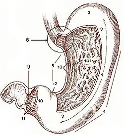 1. Body of stomach 2. Fundus 3. Anterior wall 4. Greater curvature 5. Lesser curvature 6. Cardia 9. Pyloric sphincter 10. Pyloric antrum 11. Pyloric canal 12. Angular notch 13. Gastric Canal 14. Rugal folds