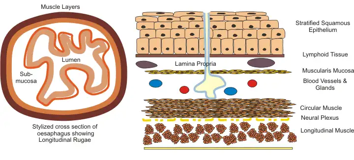 The longitudinal rugae disappear on swallowing. The sub-mucosal layer consists of loose fibrous tissue and elastic tissue that allow expansion.