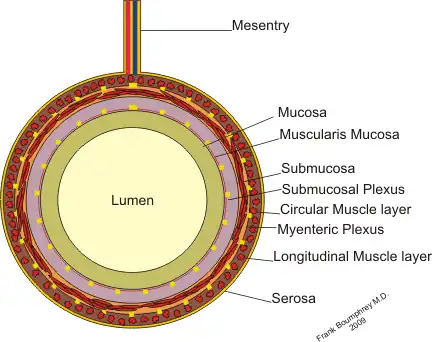 - A serosal layer which is continuous with the mesentry