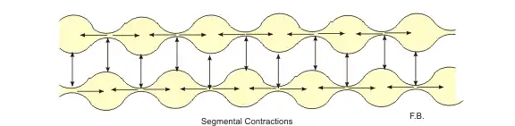 Segmental contractions are used for mixing food or chyme. The circular muscles in adjacent segments of the intestine undergo alternate contraction and relaxation. The effect of this is not to move food along the lumen, but to churn it and mix it, especially with the digestive juices. Segmental contractions also bring the chyme into contact with the epithelial cells for absorption.