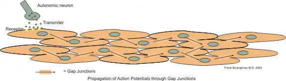 Muscle cells in the intestine communicate with each other through gap junctions, causing a series of function syncitial units. Thus an action potential in one cell will spread to other cells in the unit.