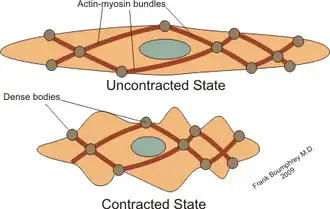 Smooth or un-striated muscle cells contract by altering their shape. They contain numerous actin-myosin bundles. Some of the actin Strands attach to the cell, they are all anchored to dense bodies in the cytoplasm of the cell. On activation the actin strands slide over the myosin causing shortening of the actin-myosin bundle: