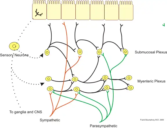 The mucosa and epithelium also have sensory nerve endings that feed signals to the both layers of the enteric plexus as well as sending information back to the sympathetic pre-vertebral ganglia, the spinal cord and to the brain stem. This arrangement is shown in the following diagram.