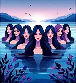 A Helloi, also known as Heloi, is a divine female figure, who is attractive, beautiful, charming and seductive to wandering menfolk, frequently depicted as roaming in forests, grasslands, mountainsides, lonely places or sparsely human populated areas. According to classical Meitei tradition, there are seven helloi ladies who are considered to be the noble princesses of the celestial realm and the favorite daughters of Heavenly King Salailen, the Father Sky. Many legends often praise that the youngest of all the helloi sisters is the most beautiful, the most gentle, the most innocent, the most lovable, etc. There are numerous ancient Meitei folktales of the youngest helloi sister falling in love with a mortal man. These ancient Meitei mythological seven divine sisters are considered to be the paragon of beauties and the epitome of charms, giving fascination and inspiration to numerous cultures across South Asia and Southeast Asia in modern times.