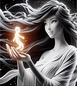 Goddess Khamnung Kikoi Louonbi, also known as Nura Naothem Heibi, is a divine enchantress, associated with death. Her main duty is to collect the souls of the deceased and to bring them to netherworld, the land of death, where God Thongalen ruled supreme. Sometimes, she faces challenges from some souls who are not willing to depart the earthly realm. In such case, she uses to disguise herself as either the mother or the closest and the most trusted person of the very person of that particular troublesome disobedient soul. In most cases, she succeeds in bringing the souls by hook or by crook to the underworld. She is depicted as a very intelligent and smart lady. She is one of the wives of God King Thongalen, the deity of death.