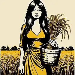 Goddess Phouoibi, also known as Phouleima, is a divine female personification of the paddy plant, growing in the agricultural lands. She is one of the noble princesses of the Celestial Realm. She is one of the favorite daughters of Heavenly Father, Salailen, the Sky God. She was sent by her father down to earth to prosper the human civilization. She, along with her other sisters, descended from the heavenly realm to the earthly realm, obeying the divine orders of their Supreme Father. On her way, she used to face multiple adventures. She even fell in love with Akongjamba, a mortal handsome noble man of Kege Moirang (Keke Moilang) kingdom. But fate did not permit them to unite. So, she and her mortal lover reincarnated six further rebirths, thereby enacting the divine seven epic cycles of rebirths (incarnations). Goddess Phouoibi (as Phouleima) and her husband God Phouningthou are worshipped as deities of agricultural fertility and harvesting, by the ancient Meitei people.