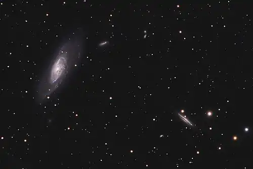 Messier 106 (also known as NGC 4258) is a w:spiral galaxy in the w:constellation w:Canes Venatici. It was discovered by w:Pierre Méchain in w:1781. M106 is at a distance of about 22 to 25 million w:light-years away from w:Earth. It is also a Seyfert II galaxy, which means that due to w:x-rays and unusual w:emission lines detected, it is suspected that part of the galaxy is falling into a w:supermassive black hole in the center.[7] w:NGC 4217 is a possible companion galaxy of Messier 106.[6]