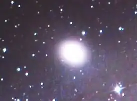 Messier 32 (also known as NGC 221 and w:Le Gentil) is a w:dwarf elliptical galaxy about 2.65 million w:light-years away in the w:constellation Andromeda. M32 is a w:satellite galaxy of the famous w:Andromeda Galaxy (M31) and was discovered by w:Le Gentil in w:1749. M32 measures only 6.5 ± 0.2 kly[5] in diameter at the widest point. Like most w:elliptical galaxies, M32 contains mostly older faint red and yellow stars with practically no dust or gas and consequently no current w:star formation.[6] It does, however, show hints of star formation in the relatively recent past.