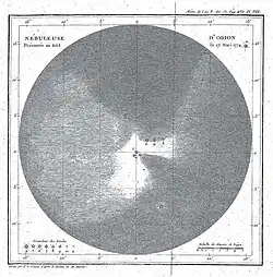 The Orion Nebula is generally credited as being first discovered in w:1610 by w:Nicolas-Claude Fabri de Peiresc as noted in Peiresc's own records. Cysatus of w:Lucerne, a w:Jesuit astronomer, was the first to publish note of it (albeit somewhat ambiguously) in a book about a bright w:comet in 1618. It was independently discovered by several prominent astronomers in the following years, including w:Christiaan Huygens in 1656 (whose sketch was the first published in 1659). w:Charles Messier first noted the nebula on March 4, w:1769, and he also noted three of the stars in Trapezium. (The first detection of these three stars is now credited to Galileo in 1617, but he did not notice the surrounding nebula—possibly due to the narrow field of vision of his early w:telescope.) Charles Messier published the first edition of his catalog of deep sky objects in 1774 (completed in 1771).[14] As the Orion Nebula was the 42nd object in his list, it became identified as M42.