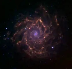 Messier 74 (also known as NGC 628) is a face-on w:spiral galaxy in the w:constellation Pisces. The galaxy contains two clearly-defined w:spiral arms and is therefore used as an archetypal example of a w:Grand Design Spiral Galaxy.[4] The galaxy's low surface brightness makes it the most difficult Messier object for amateur astronomers to observe.[5][6] However, the relatively large angular size of the galaxy and the galaxy's face-on orientation make it an ideal object for professional astronomers who want to study w:spiral arm structure and spiral density waves.