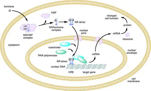 - For nuclear receptors, a small molecule -binds to an inactive nuclear receptor causing conformational changes that result in protein-DNA interaction, recruitment of cofactors, transcription factors ultimately leading to gene transcription. After dissociation of the agonist, the nuclear receptor may return to its inactive state.
