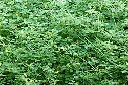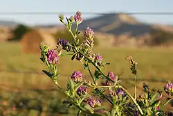 - Alfalfa (Medicago sativa) is a flowering plant in the pea family Fabaceae cultivated as an important forage crop.( http://en.wikipedia.org/wiki/Alfalfa)