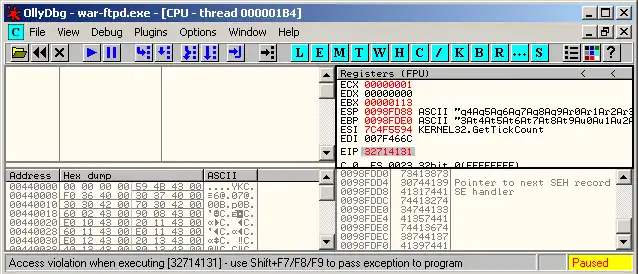 Then, we save our modified PoC code. We start the War-FTPD FTP server. We run our debugger and attach it to the War-FTPD process. We launch our exploit...